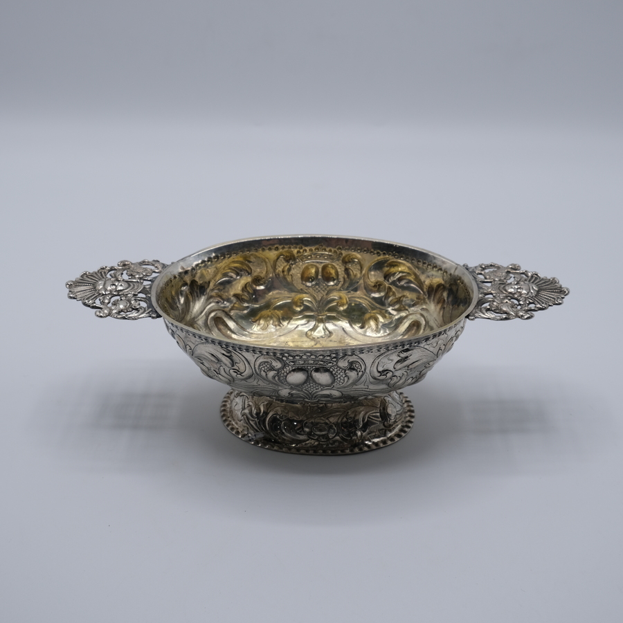 Zilveren brandewijnkom, onder meer versierd met drijfwerk van acantusbladeren. 1780,Lucas Oling, Leeuwarden.