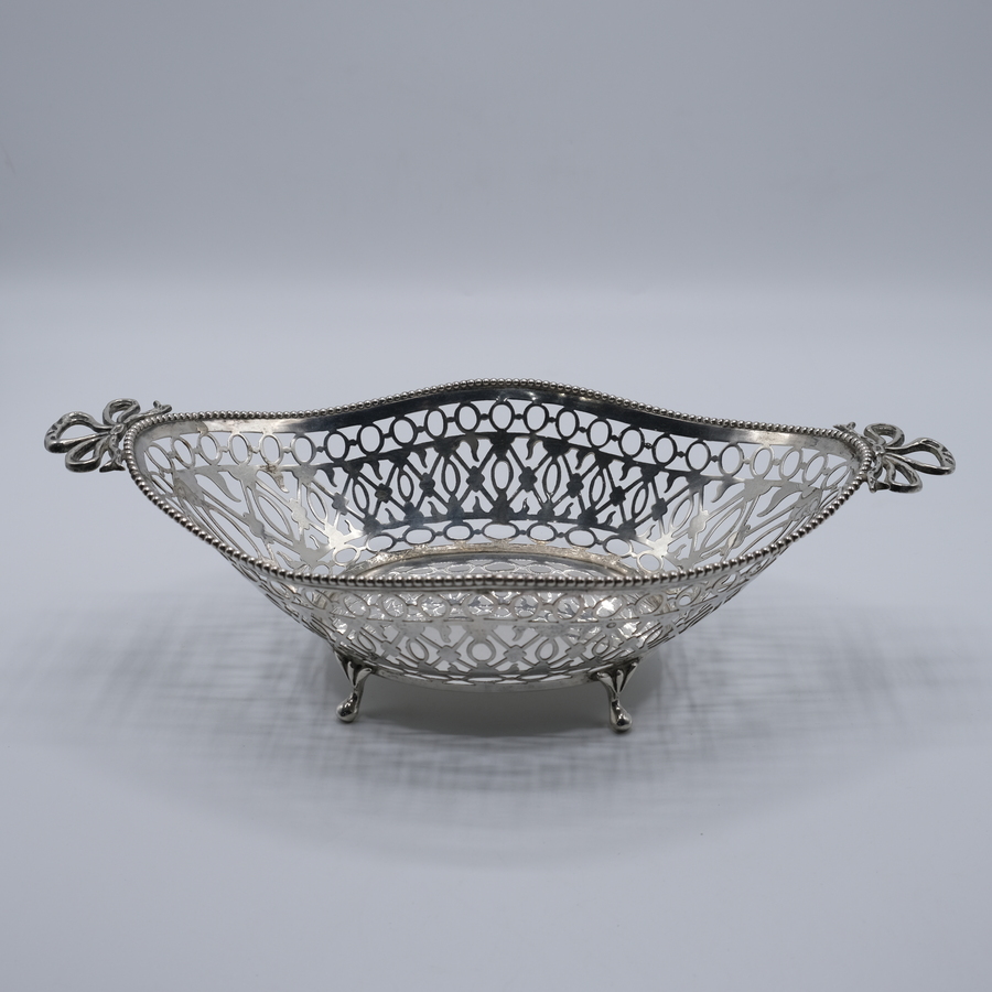 Fraaie zilveren broodmand met onder meer twee grepen in de vorm van strikjes. geheel geplaatst op vier leewenklauwtjes.