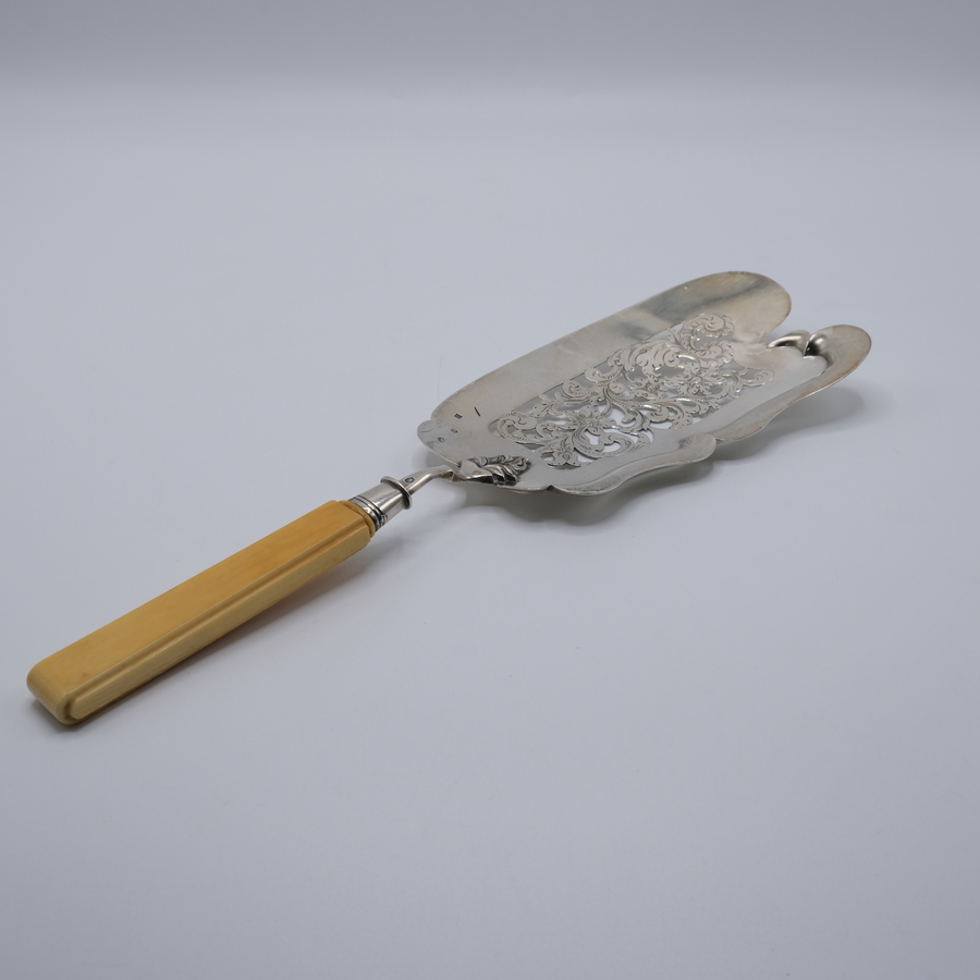 Met graveer- en zaagwerk versierde zilveren visschep. J. v.d.Vorst, Rotterdam, 1854.