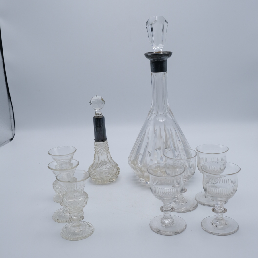 Twee kristallen karaffen met 1e gehalte (925/1000) zilveren halsen en originele stoppen. Hierbij zeven kristallen glazen. 20e eeuws.