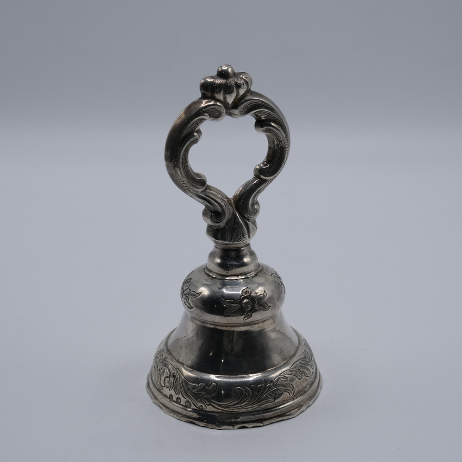 Zilveren tafelbel, versierd met drijfwerken met een bronzen binnenbel, 1879.
