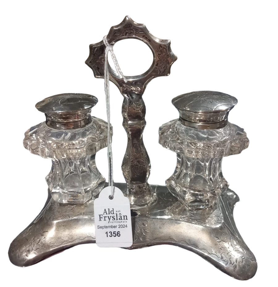 Zilveren inktstel met twee kristallen potjes op zilveren basement, 1860.