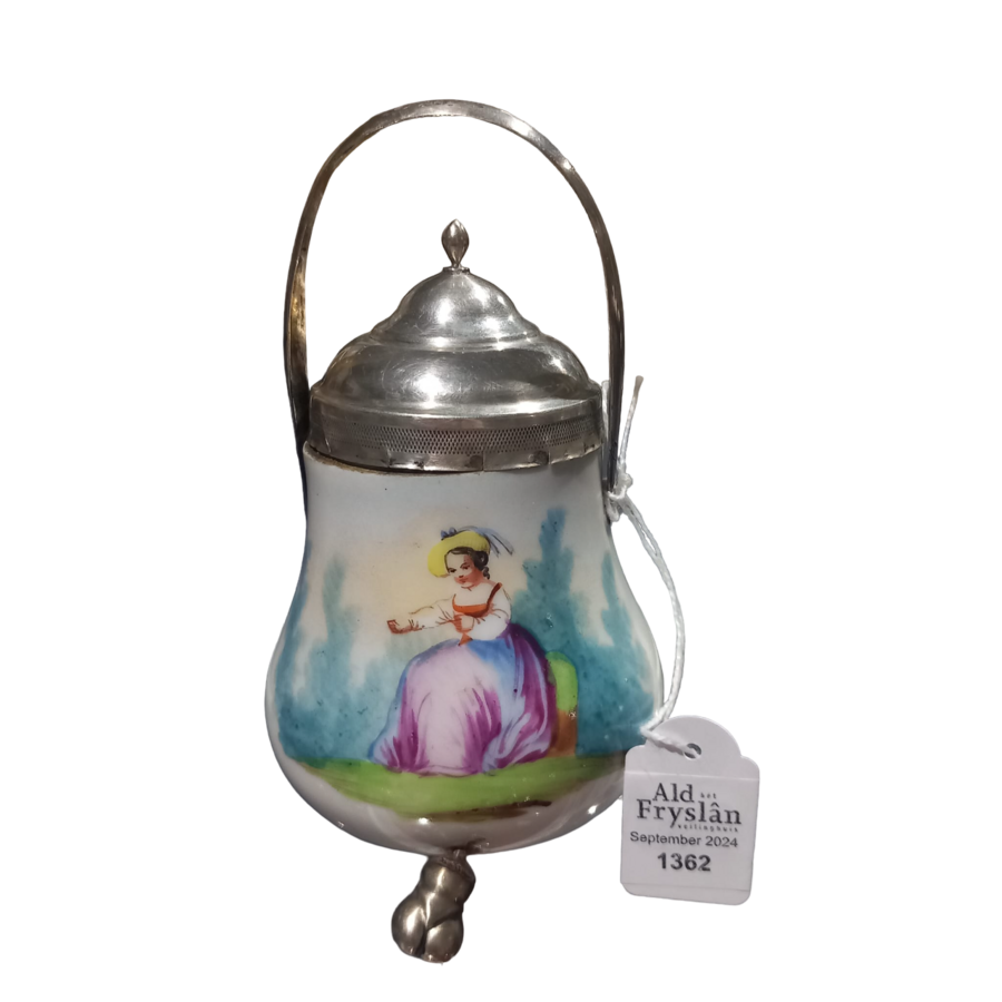 Porseleinen zwavelstokkenpotje met zilveren deksel, hengsel en pootjes.