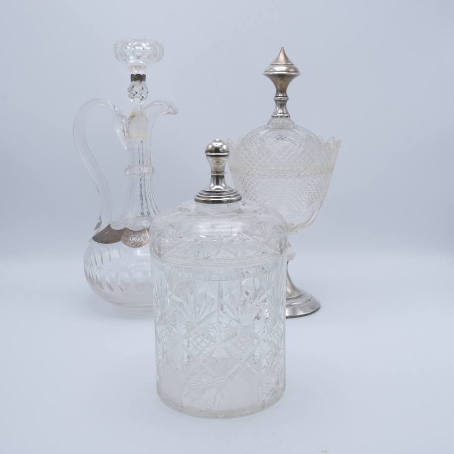 Lot van drie stuks antiek kristal: een kristallen beschuitbus met ruit- en sterslijpsel en tweede gehalte (835/1000) zilveren knop met parelrand. Een gembercoupe net ruitslijpsel en tweede geha...