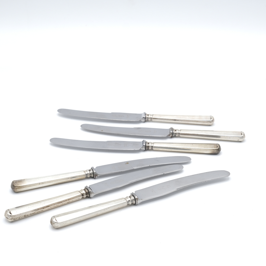 Lot van zes 20e eeuwse fruitmesjes met tweede gehalte (835/1000) zilveren heft, model Haags Lofje. Mr. van Kempen.
