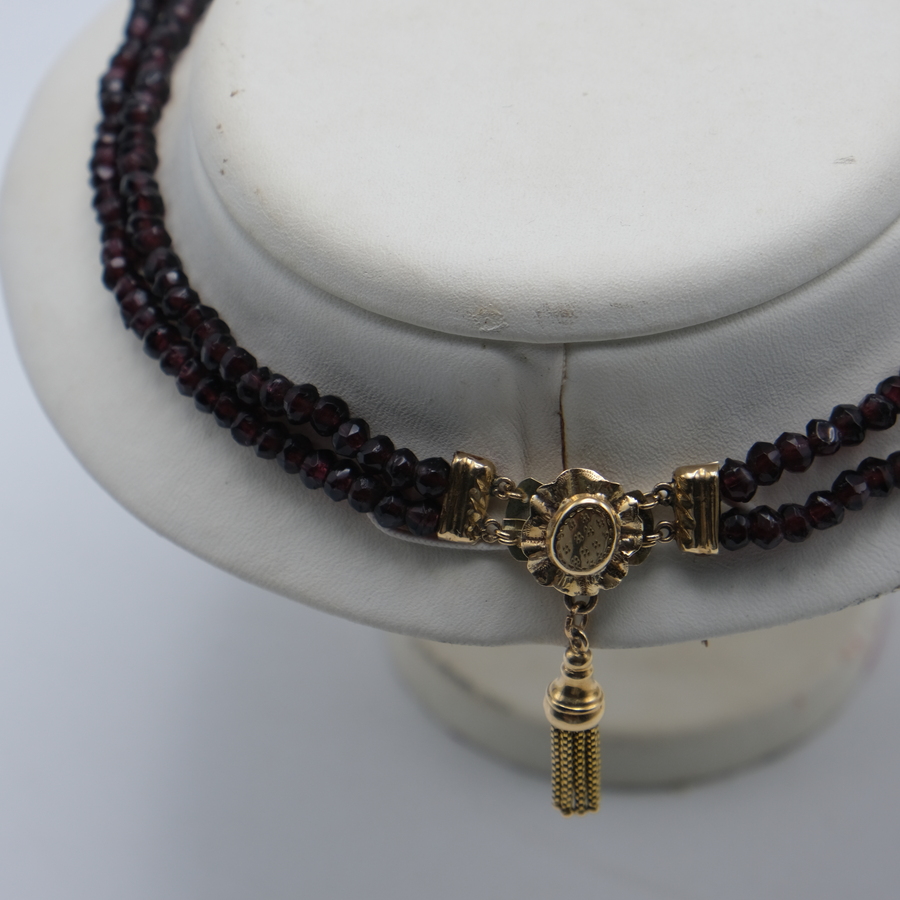 Een antiek tweerijig glasgranaten halssnoer aan een 14 krt gouden gegraveerde sluiting met kwastje.