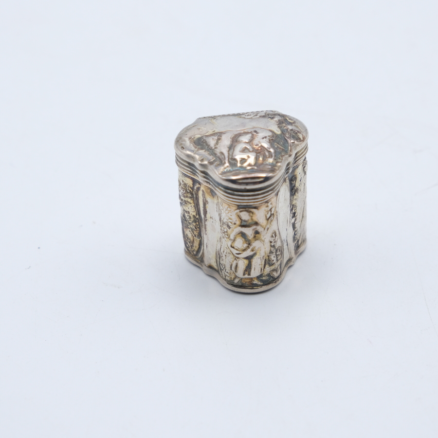 Een 2e gehalte (835/1000) zilveren lodereindoosje in gecontourneerde vorm, met romantische voorstelling rondom. Jaarletter voor 1839.