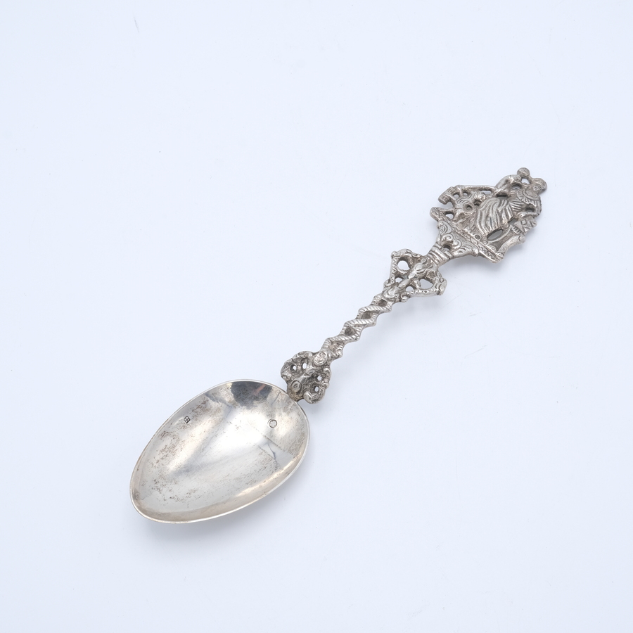 Een vroeg 20e eeuwse tweede gehalte (835/1000) zilveren geboortelepel met getorste steel en steelbekroning van de Hollandse Maagd. Mr. A.M. Sustring, Sneek Leeuwarden (1873-1925) '. Met inscript...