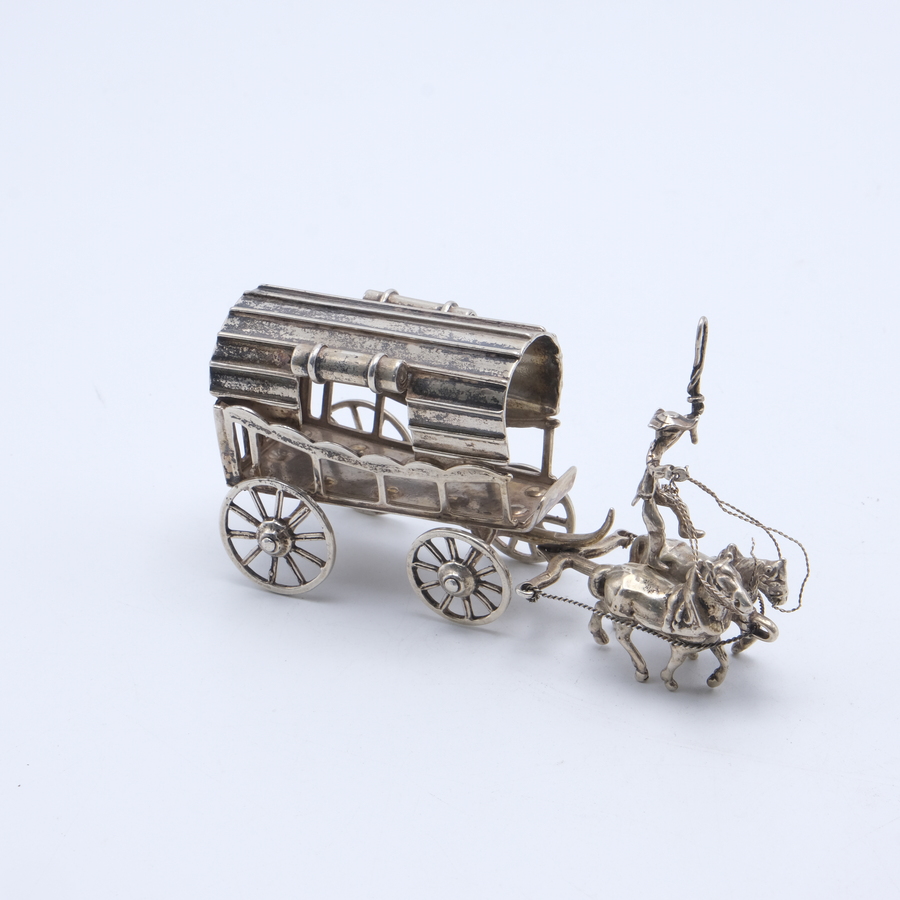 Een 20e eeuws tweede gehalte (835/1000) zilveren miniatuur van een huifkar met twee paarden en koetsier