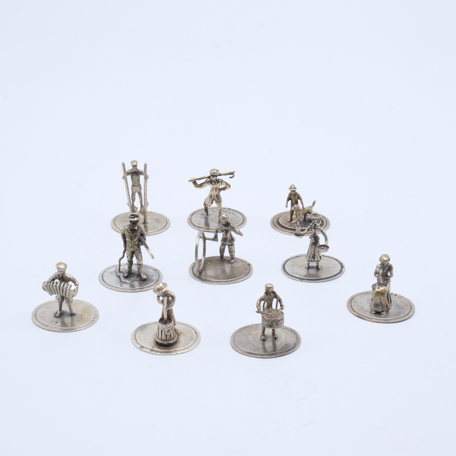Lot van tien tweede gehalte (835/1000) Nederlands zilveren miniaturen op ovale voet. O.a. jager, steltloper, man met hond, man met hoepel, vrouw met karnton, vrouw met spiegel, accordeonspeler e...