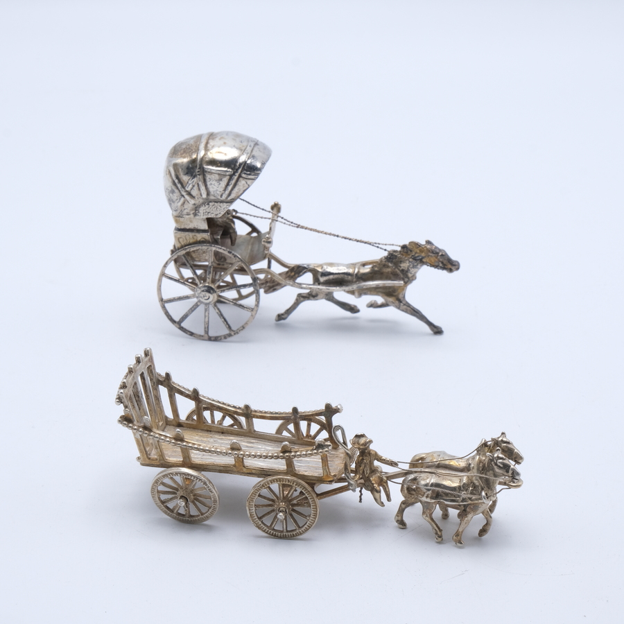 Lot van twee tweede gehalte (835/1000) Nederlands zilveren miniaturen: hooiwagen met twee paarden en kleine koets met één paard