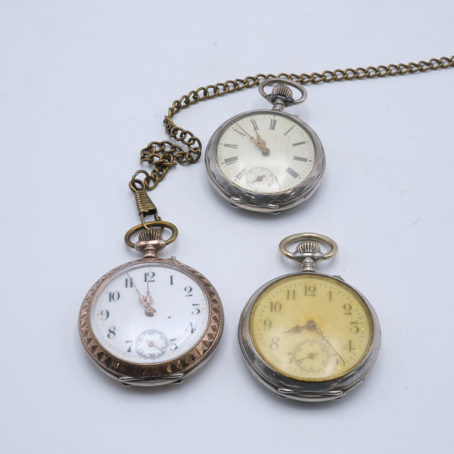 Lot van drie diverse zakhorloges, één aan koperen zakhorlogeketting, allen in derde gehalte (800/1000) zilveren kast