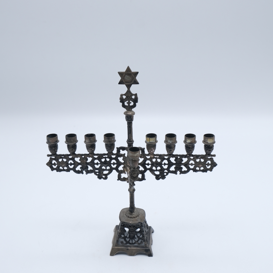 Een 2e gehalte, 835/1000 zilveren Menora kandelaar. Voor negen kaarsen. Op een opengewerkte voet en bekroond met Davids ster. Middelste kaarsenhouder afneembaar. 20e eeuws.