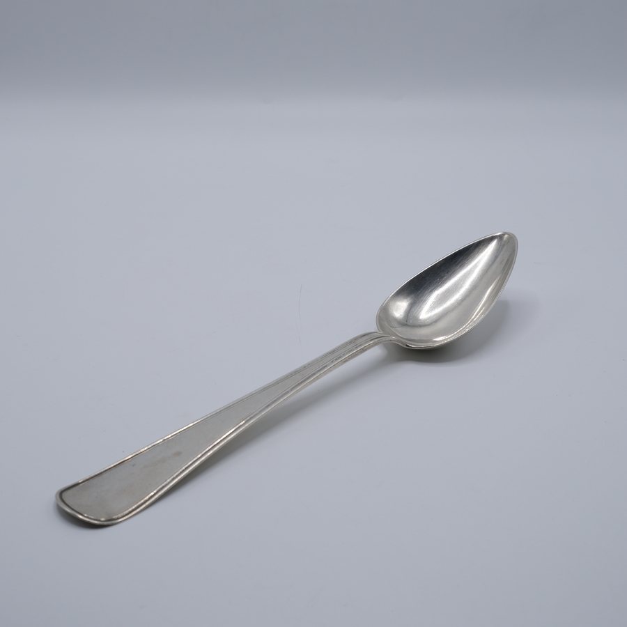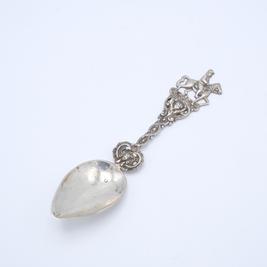 Een antieke vroeg 20e eeuwse tweede gehalte (835/1000) zilveren geboortelepel met bekroning van ruiter te paard. Inscriptie 'Jarig Anske Smit is geboren den 30 april 1904'. Mr. A.M. Sustring, Sn...