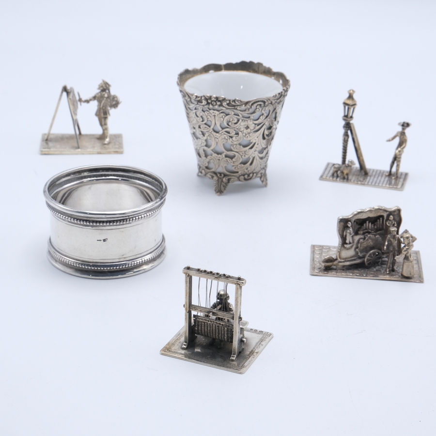 Lot divers zilver: vier tweede gehalte (835/1000) zilveren miniaturen, man met ladder bij straatlantaarn, man bij weefgetouw, drie figuren bij draaiorgel en schilder bij schildersezel. Met daarb...