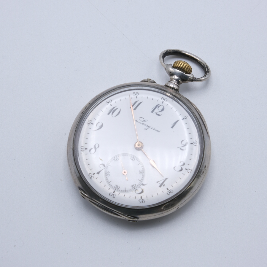 Een vroeg 20e eeuws Longines herenzakhorloge in derde gehalte (800/1000) zilveren kast. Emaille wijzerplaat met Arabische cijfers, secondeaanduiding en vergulde wijzers.