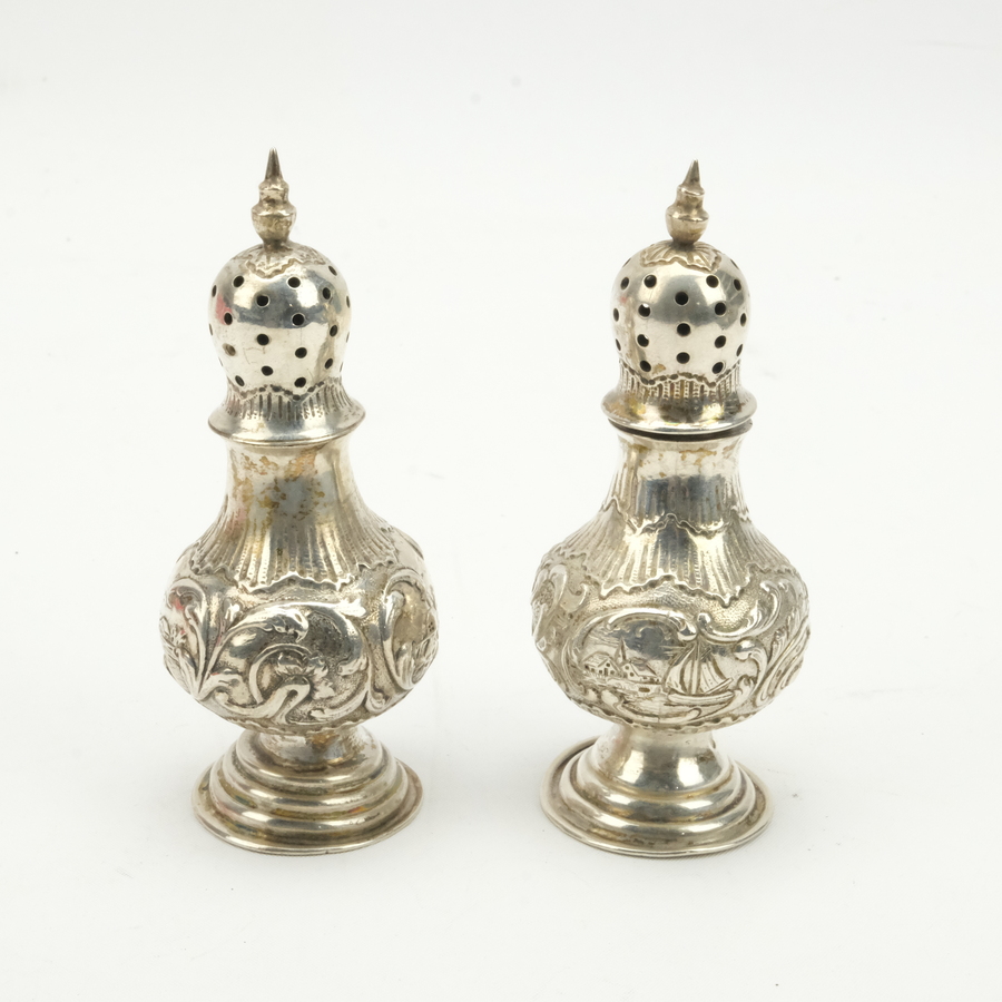 Een stel 20e eeuwse tweede gehalte (835/1000) zilveren peper- en zoutstrooier met reliëf decor van molen, zeilboot en dorp. Gemerkt 'HH' = Hendrik Hooykaas