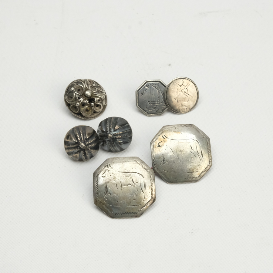 Lot van zeven 18e/19e eeuwse zilveren knopen, o.a. met afbeelding van koe en twee gemerkt Amsterdam