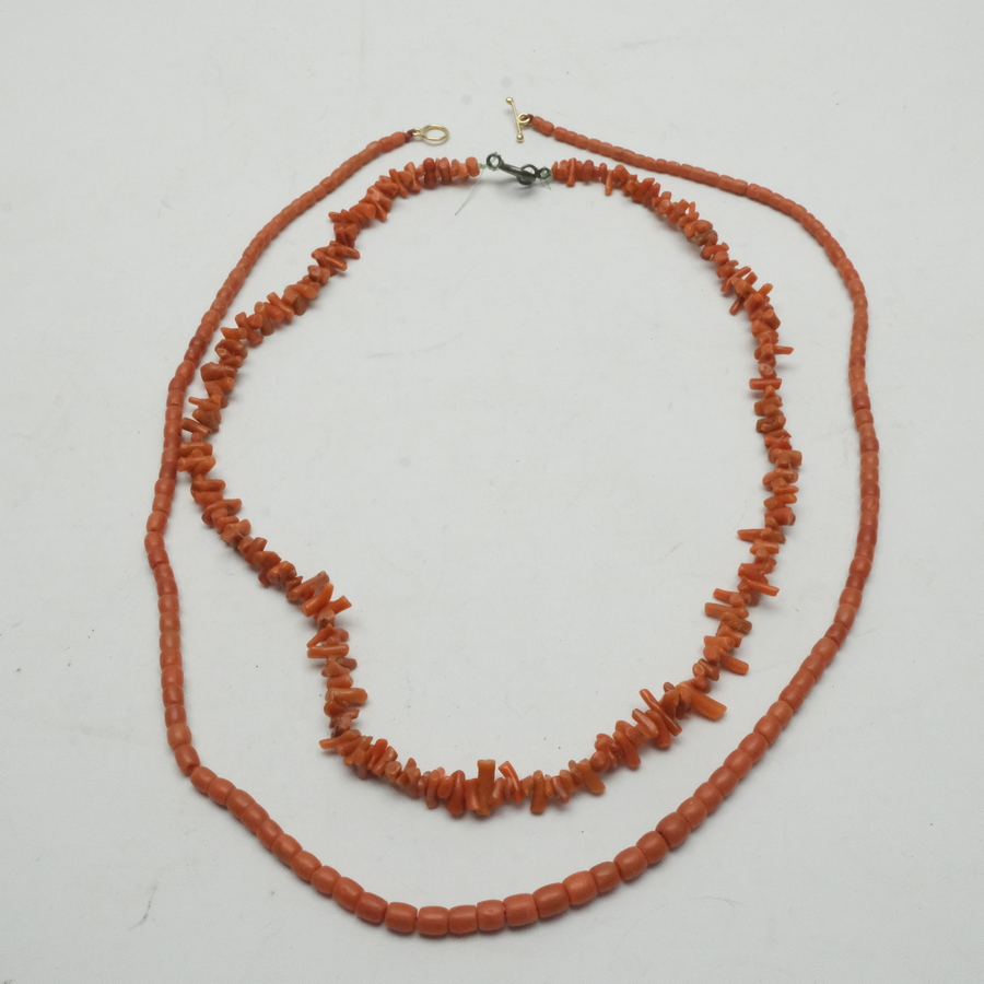Lot van twee bloedkoralen colliers: een staafjecollier met zilveren slotje en een collier met gouden slot