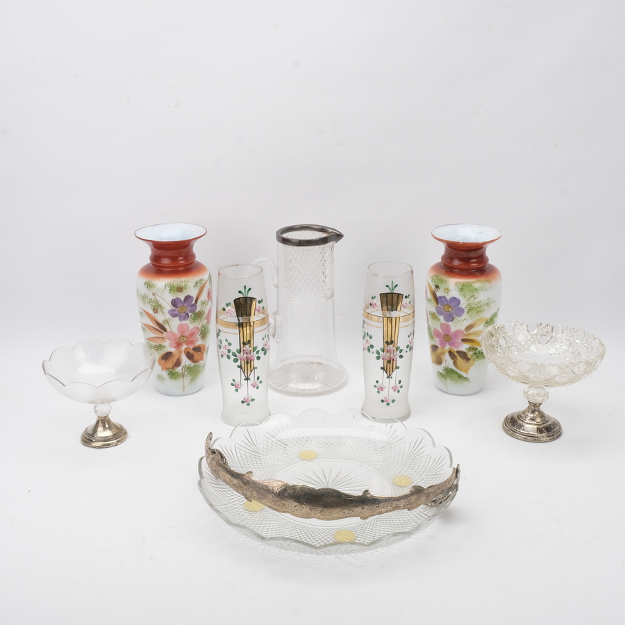 Lot divers, waaronder twee opaline vazen, een Engelse kristallen waterkan met eerste gehalte zilveren montuur en een kristallen cakeschaal met ruitslijpsel en 19e eeuwse tweede gehalte (835/1000...