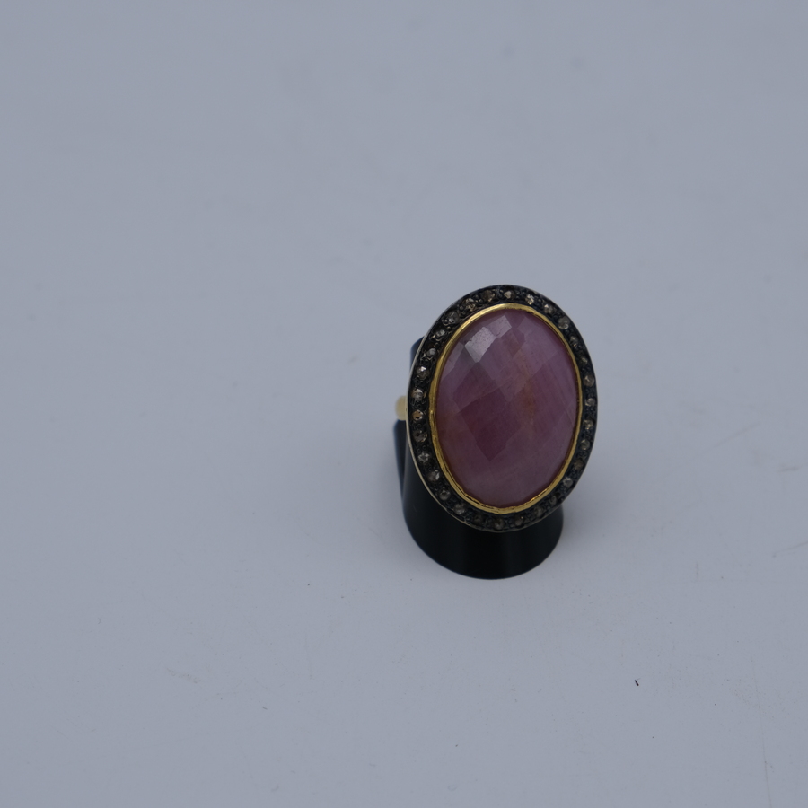 goud op zilver ring bezet met diamanten en rhodoniet .