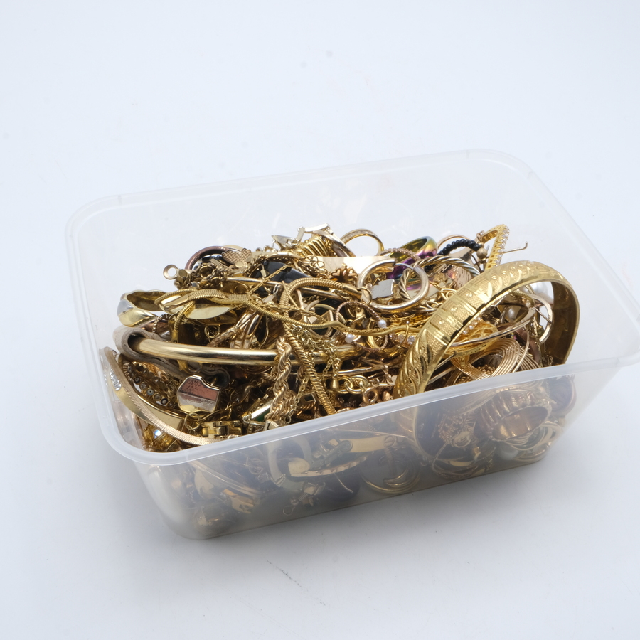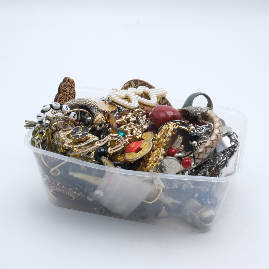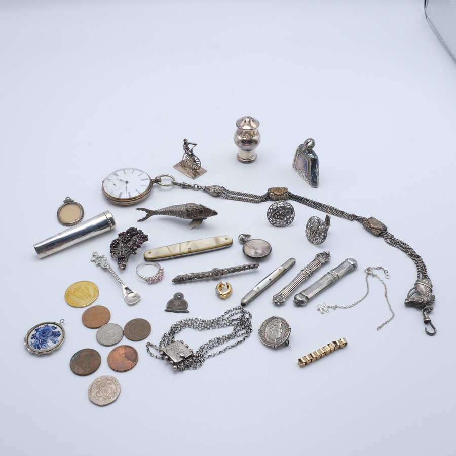 Groot lot divers zilver, waaronder een zakhorloge aan horlogeketting, manchetknopen, strooibusje, miniatuur met figuur op hoge bi