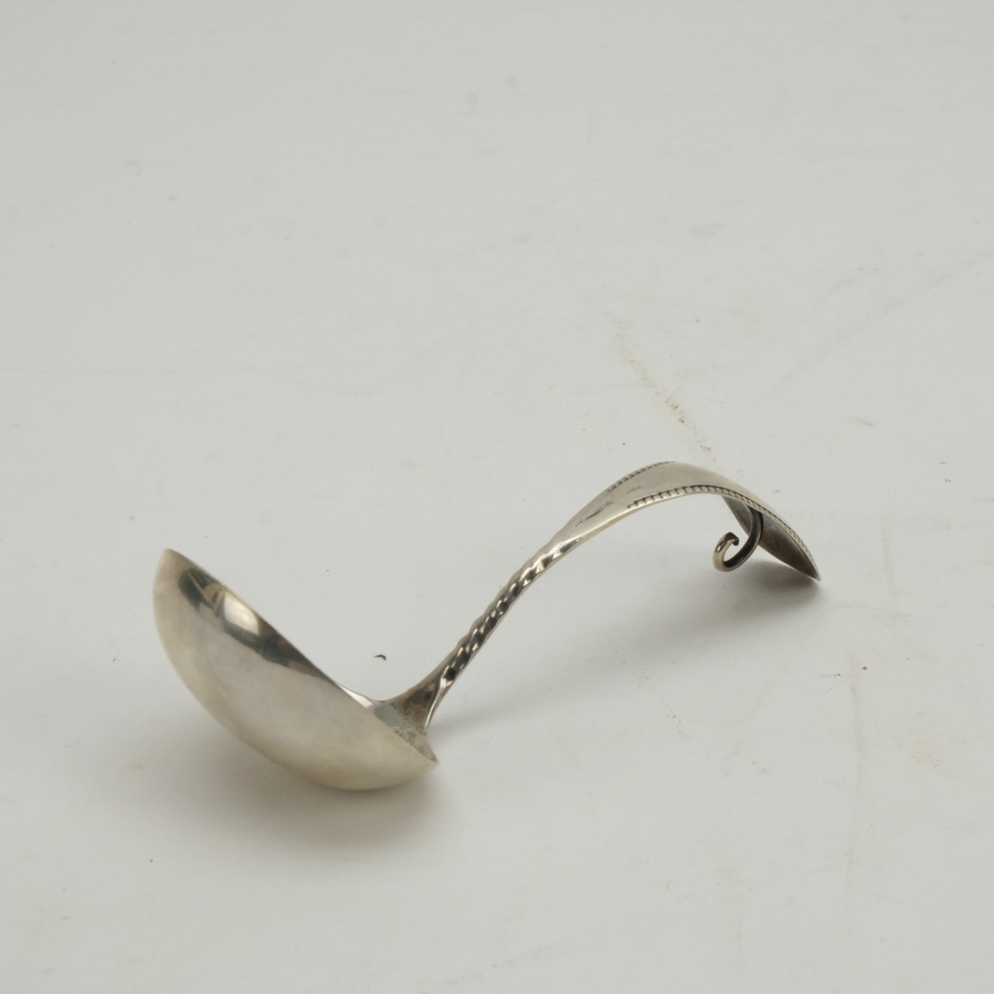 Een 19e eeuwse tweede gehalte (835/1000) zilveren roomlepel, getorste steel, versierd met parelrand en graveerwerk. Gemerkt '77B' = Brunings, Joure, 1887.