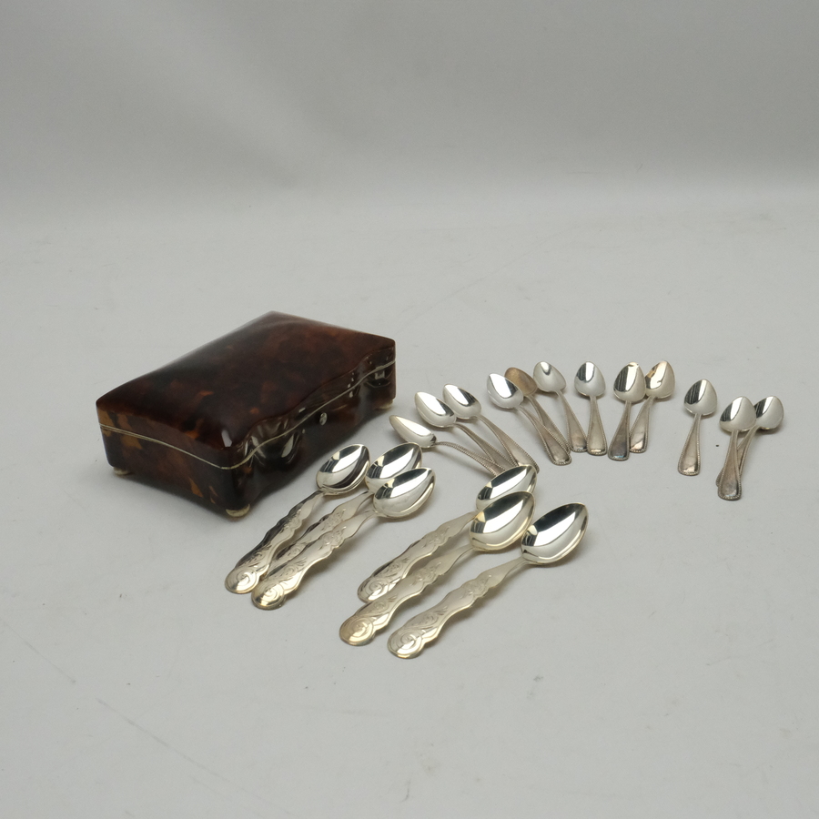 Een antiek 19e eeuws schildpad lepeldoosje, op bolpootjes, gevuld met achttien tweede gehalte (835/1000) zilveren advocaat- en theelepeltjes