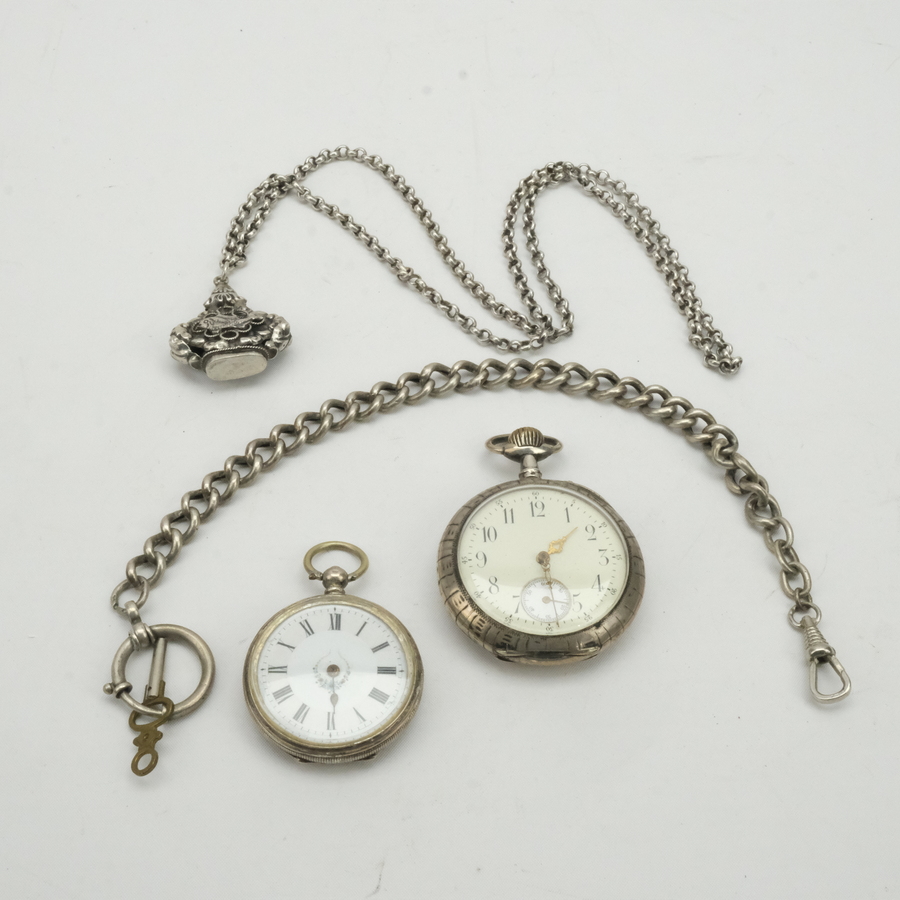 Lot: een derde gehalte (800/1000) zilveren zakhorloge met emaille wijzerplaat, kast gemerkt JBB en een derde gehalte (800/1000) zakhorloge met Arabische cijferaanduiding en secondeaanduiding. Me...
