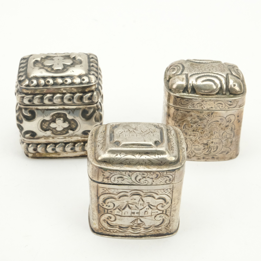 Lot van drie 19e eeuwse tweede gehalte (835/1000) zilveren lodereindoosjes. Eén floraal gegraveerd met bolle deksel en stippelgravure 'T.D.v.O 1877', gemerkt 'CC 114' = Carolus Hendricus Cammans...