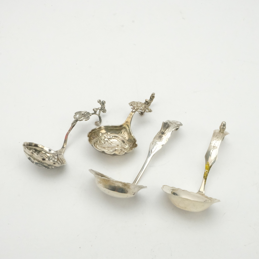 Lot van vier zilveren roomlepels: Eén 19e eeuwse met graveerwerk en bekroning van eikel op de steel, mr. van der Meulen, Joure. Een 19e eeuwse bekroond met zeilschip, gesoldeerd. Een 18e eeuwse ...
