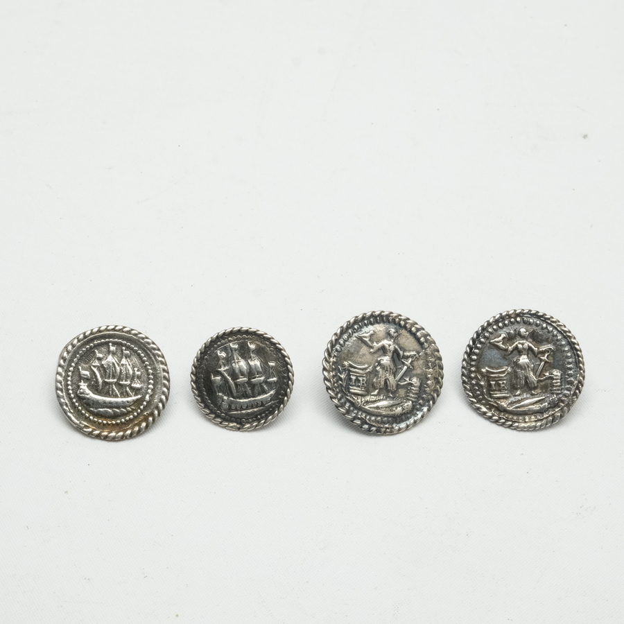 Lot van vier 18e eeuwse zilveren knopen, afbeelding van driemaster en vrouw met vogel en anker
