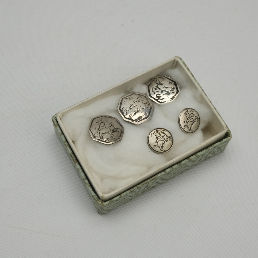 Lot van vijf 18e/19e eeuwse zilveren knopen, voorstelling van ruiter te paard