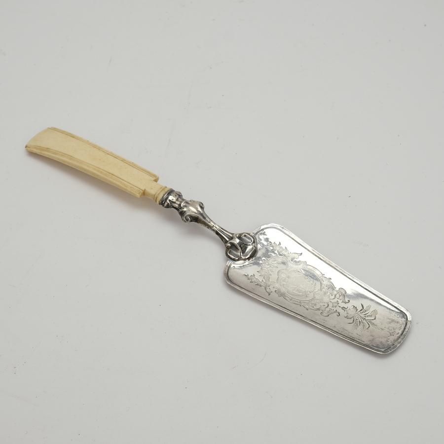 Een antieke Duits (750/1000) zilveren taartschep, gegraveerd met portret in medaillon en met benen heft. Gemerkt '13'