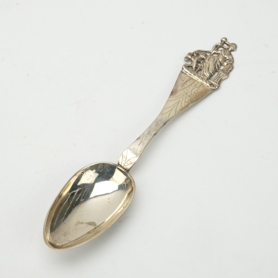 Een antieke 19 eeuwse tweede gehalte (835/1000) zilveren geboortelepel, bekroond met de Republiek. Mr. P. Binkes, Sneek 1897-1903. Met inscriptie ' Antje Lieuwes Cnossen geboren te Hommerts 27 a...
