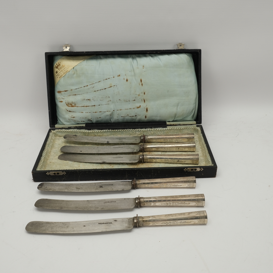 Lot van zes antieke 19e eeuwse messen met gegraveerd zilveren heft, versierd met meanderpatroon en florale motieven. Gemerkt met dolfijntje en onduidelijk meesterteken (I13?).