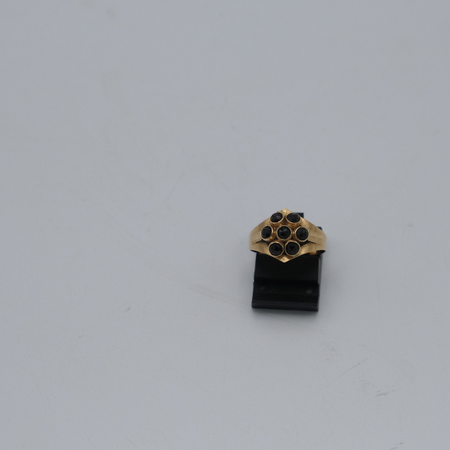 Een 14 karaats (585/1000) geelgouden damesring bezet met zeven gefacetteerde granaatjes. Gemerkt met eikenblaadje.
