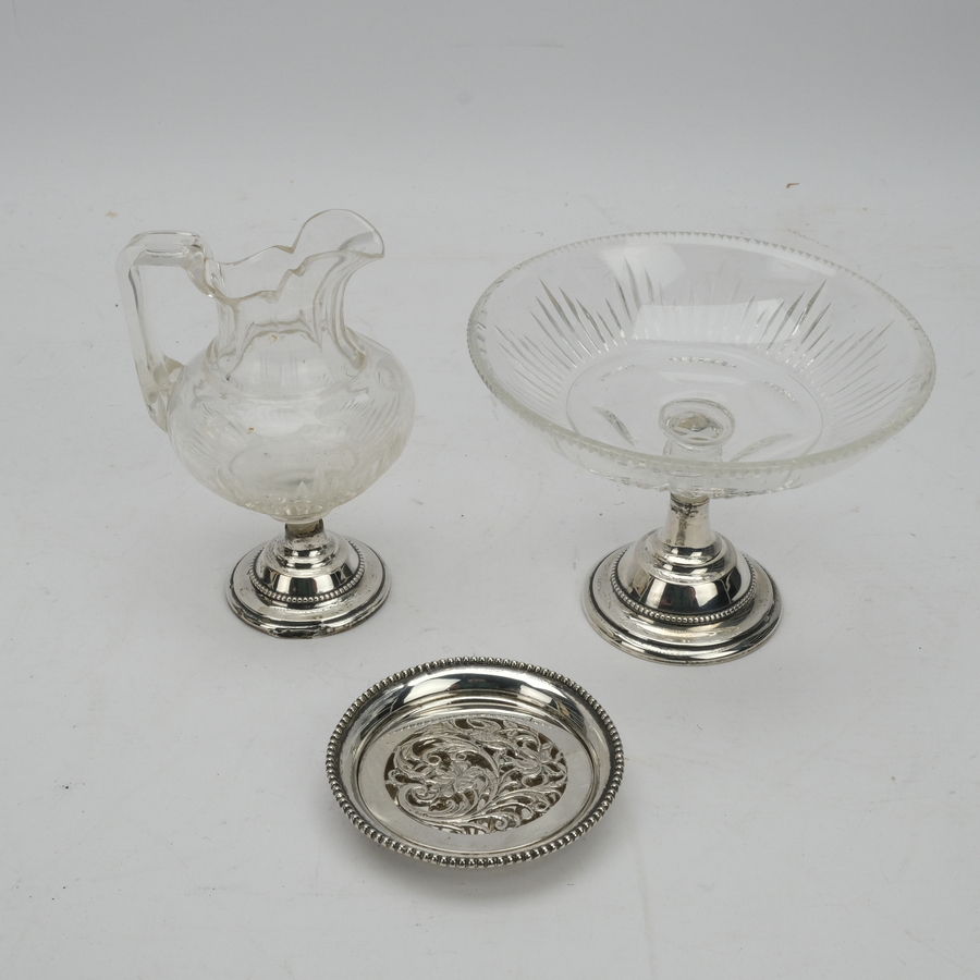 Lot divers: een kristallen melkkan op tweede gehalte (835/1000) zilveren voet, versierd met parelrand, en een bijpassend kristallen bonbonschaaltje. Met daarbij een tweede gehalte (835/1000) zil...