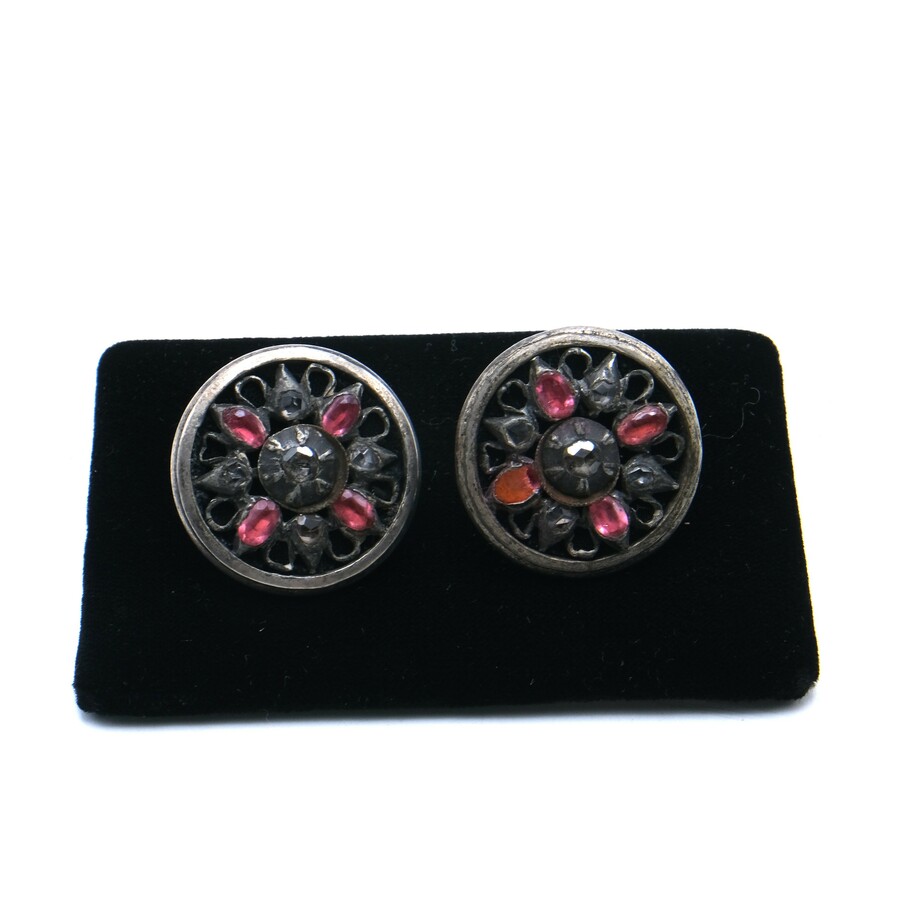 Twee antieke oorclips bezet met roosgeslepen diamanten en roze steen (saffier?)