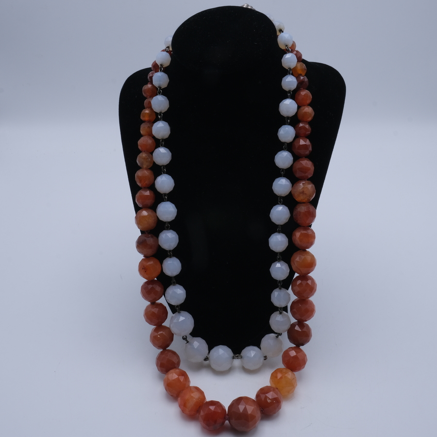 Lot van twee colliers: een lang collier met gefacetteerde carneool en zilveren bolsluiting, en een wit stenen collier, tevens met zilveren sluiting