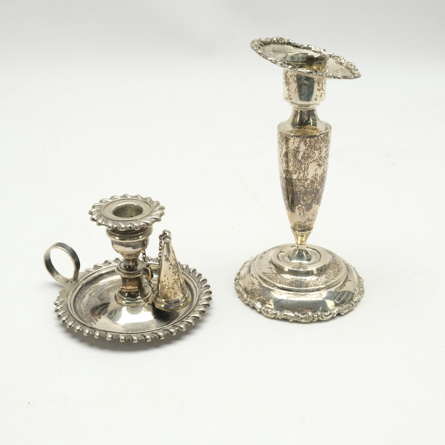 Lot van twee stuks zilver: een eerste gehalte (925/1000) zilveren blaker, gemerkt Sterling, en een eerste gehalte zilveren tafelkandelaar