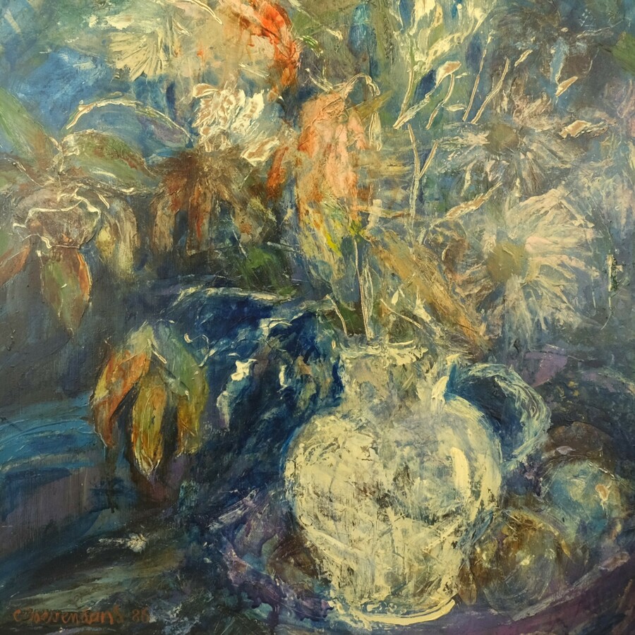 Schilderij, olieverf op doek. Stilleven met bloemen in een kruik. Linksonder gesigneerd Coby Doevendans (Sneek, 1946), gedateerd 1988.