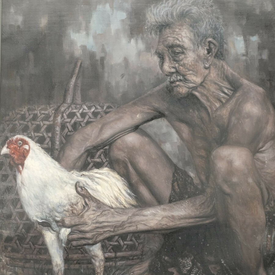 Schilderij, olieverf op doek. Man met een kip en een mand. Indonesische school, 20e eeuws. Onduidelijk gesigneerd (Martha?) en opschrift 'Ubud Bali'.