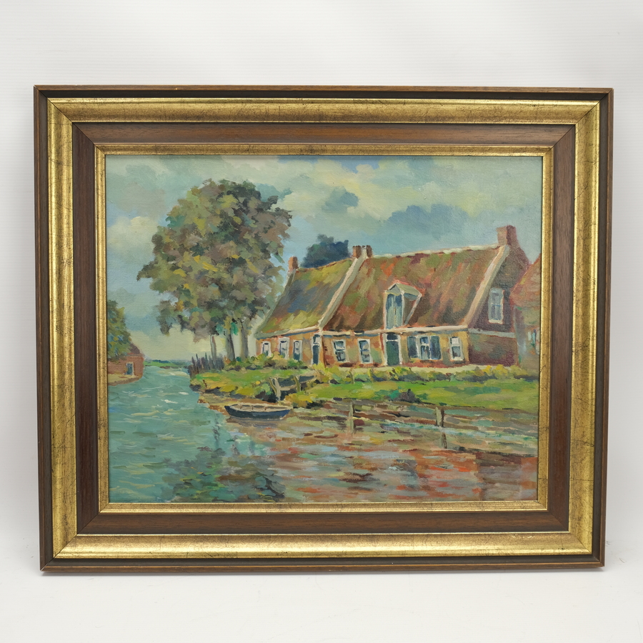 Schilderij, olieverf op doek. Boerderij aan het Damsterdiep. Ongesigneerd werk van J.A. van Royen, ca. 1940.