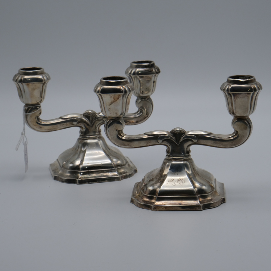 Twee tweede gehalte (835/1000) zilveren tweelichts tafelkandelaars. Gemerkt Jakob Grimminger, Schwabisch Gmund
