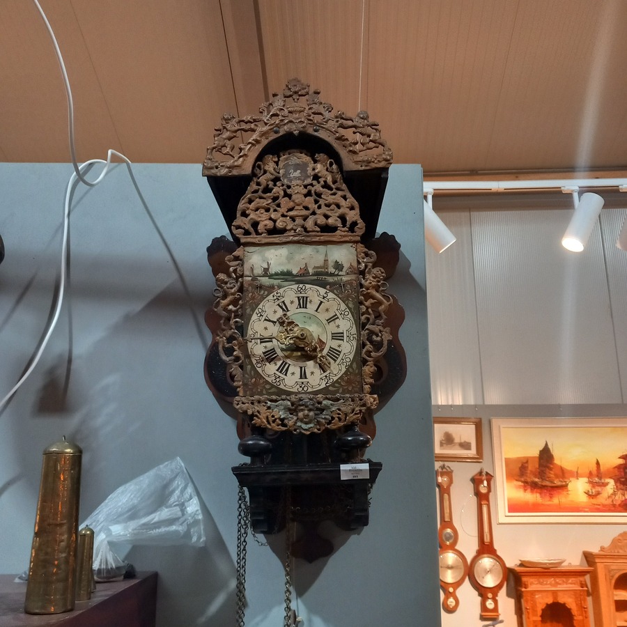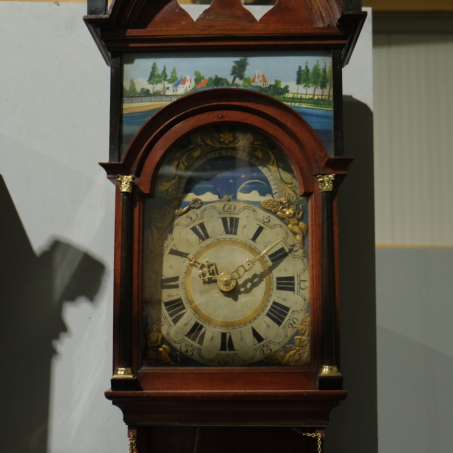 Friese staartklok met dubbele kap. Wijzerplaat versierd met maan- en datumaanduiding en de vier jaargetijden.
