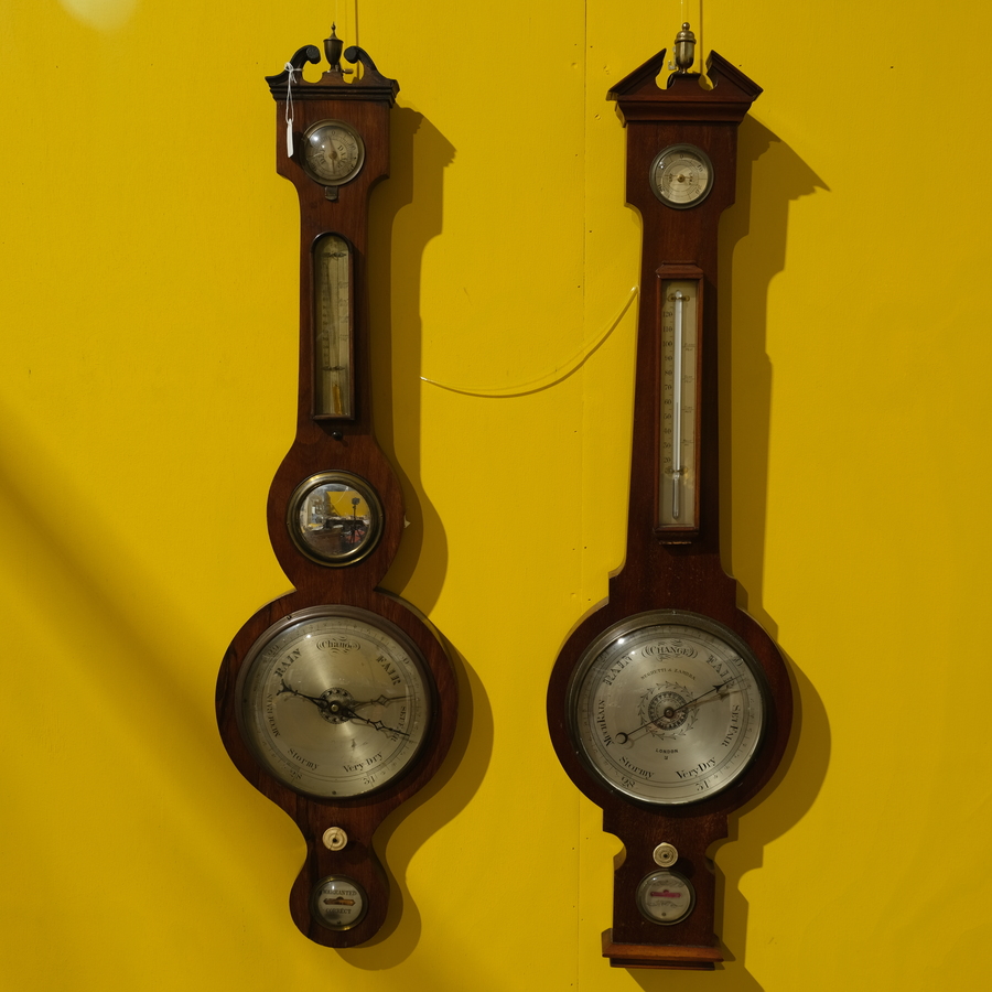 Lot van twee antieke 19e eeuwse Engelse mahoniehouten gefineerde banjobarometers, één met butlerspiegel, beide met vochtigheidsmeter, barometer en thermometer, één gemerkt ‘Negretti & Zambra...
