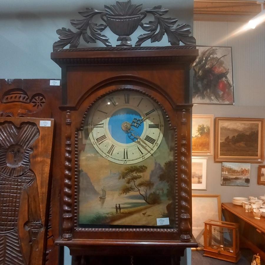 Mahoniehouten Biedermeier Friese staartklok, uurwerk met gaand-en slaand werk en wekkermechanisme, met orginele antieke gewichten.