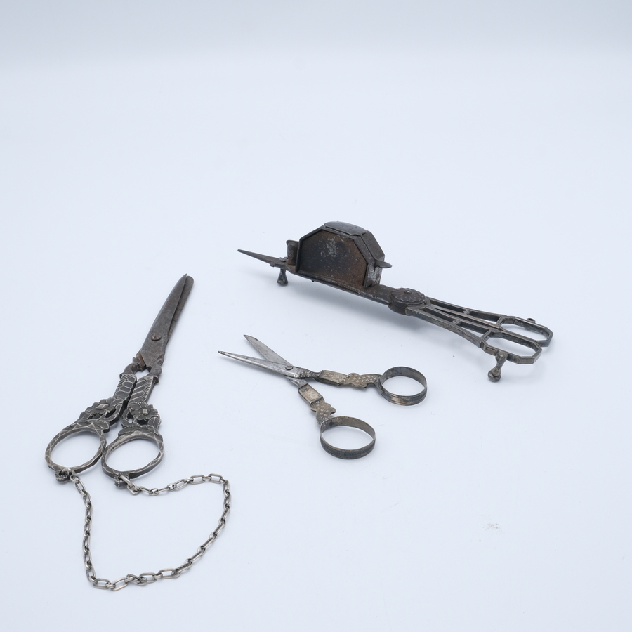Lot van drie antieke scharen: een 19e eeuwse ijzeren kaarsensnuiter in Louis XVI stijl, gemerkt ' Patent', en twee tweede gehalte (835/1000) zilveren naaischaartjes, waaronder een voor aan chate...