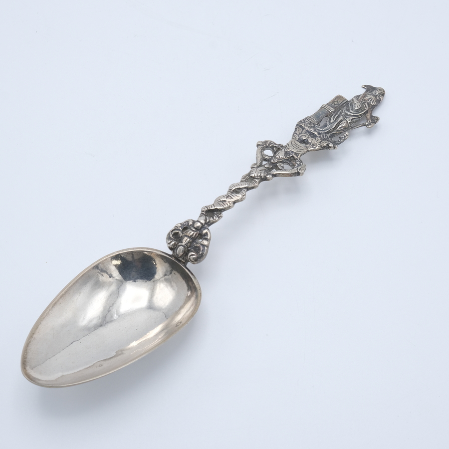Een 19e eeuwse tweede gehalte (835/1000) zilveren geboortelepel met getorste steel en bekroning van de Hollandse Maagd. Met inscriptie 'terp Budaard (?) J.J. Wiersma'.